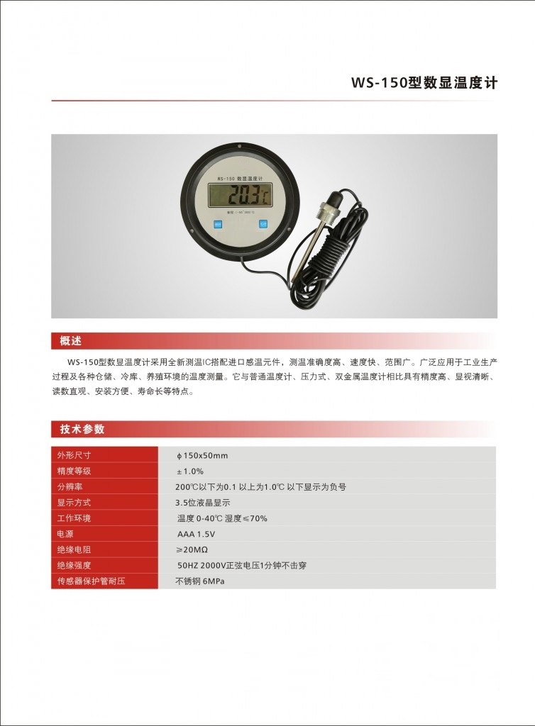 主題特點(diǎn):WS-150型數(shù)顯溫度計(jì)采用全新測(cè)量IC,搭配進(jìn)口感溫元件,測(cè)溫準(zhǔn)確度高,速度快,范圍廣。廣泛應(yīng)用于工業(yè)生產(chǎn)過(guò)程中,及各種倉(cāng)儲(chǔ),冷庫(kù),養(yǎng)殖環(huán)境的溫度測(cè)量。
